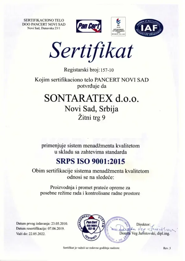 Politika kvaliteta daje okvir poslovnom sistemu Sontaratex doo za stalno održavanje i unapređivanje nivoa efektivnosti i efikasnosti poslovanja sa ciljem postizanja vrhunskog kvaliteta ulsuga i proizvoda i zadovoljenja zahteva korisnika – kupaca